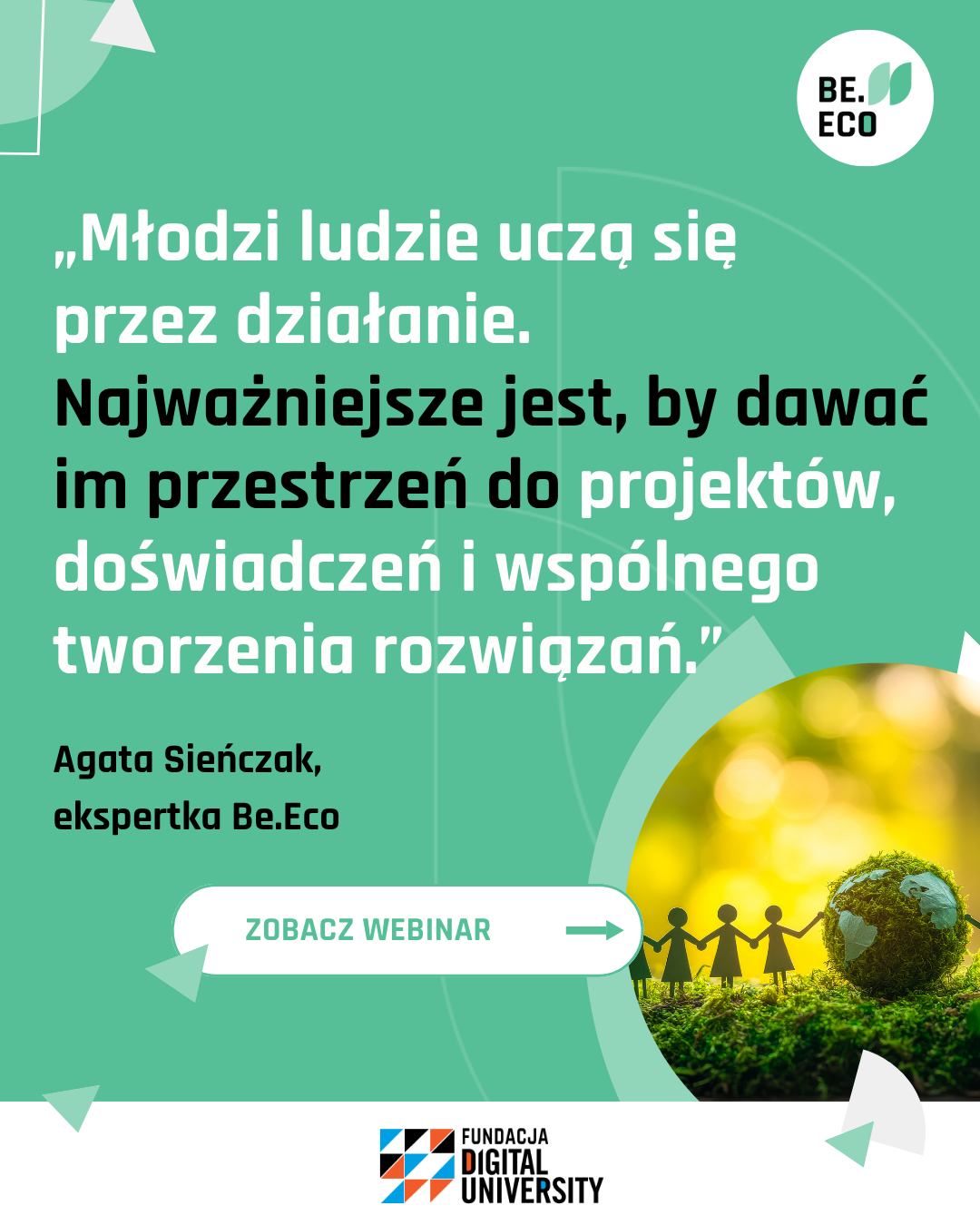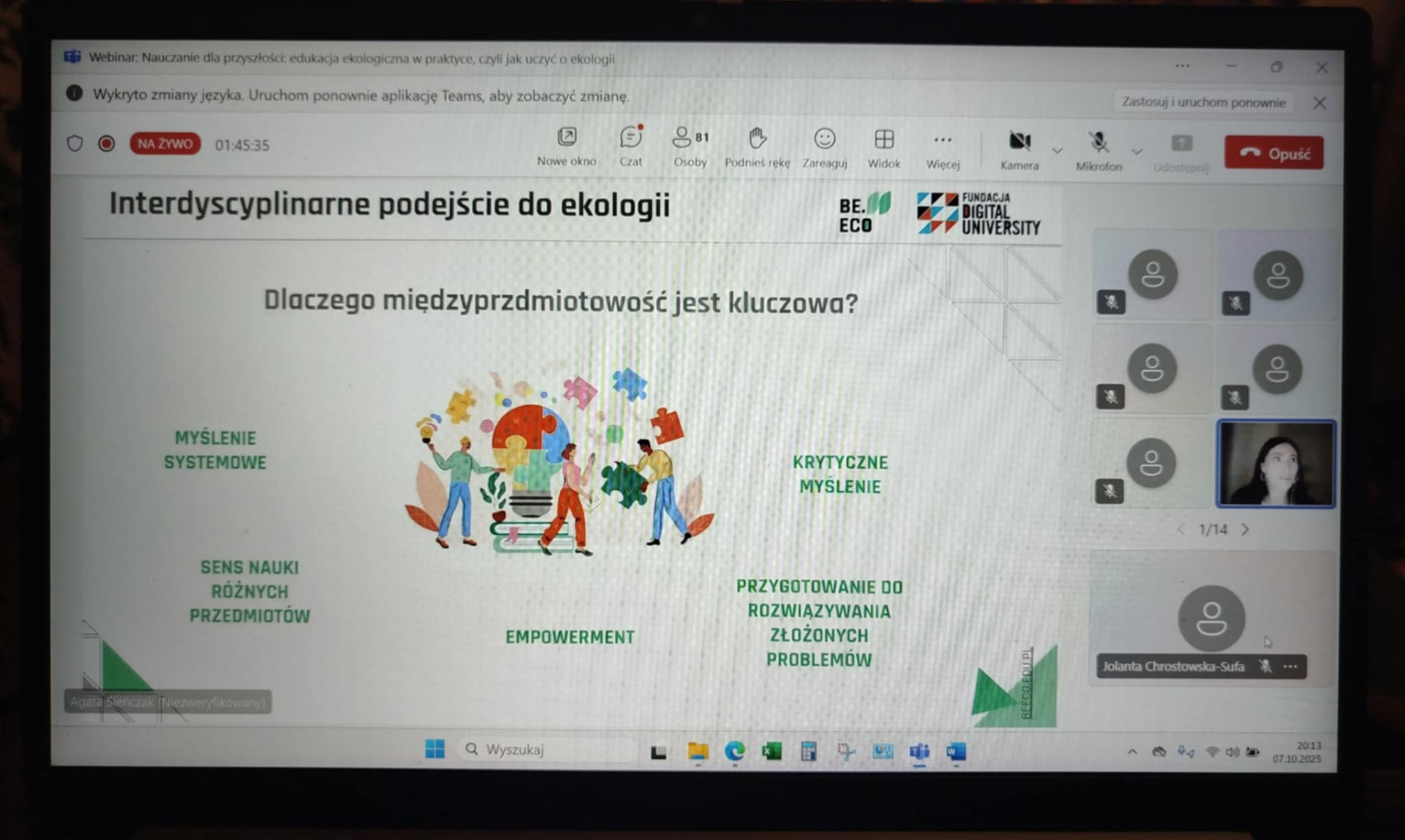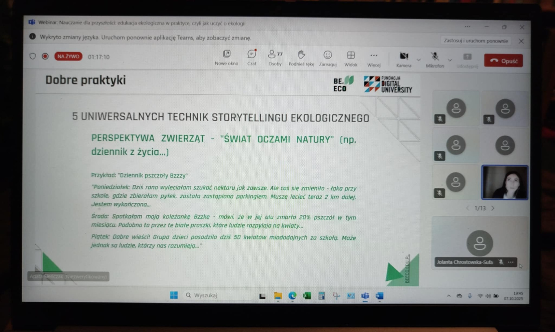 Podczas webinaru ekspertka Be.Eco Pani Agata Sieńczak dzieliła się swoim doświadczeniem i opowiadała, jak przekładać temat ekologii na codzienną pracę nauczycieli – w sposób angażujący, kreatywny i bliski doświadczeniom uczniów.