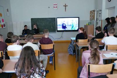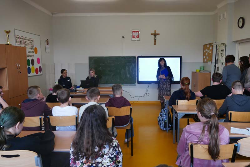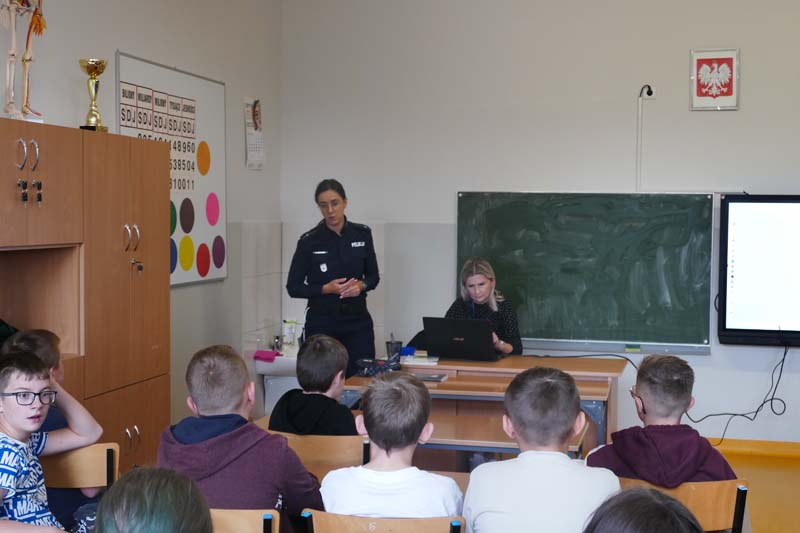 Dn.30.10.2025r w naszej szkole, w ramach Kampanii „Dzieciństwo bez przemocy” odbyło się spotkanie z funkcjonariuszkami Komendy Powiatowej Policji w Zambrowie, w którym wzięli udział uczniowie kl. IV-VIII wraz z wychowawcami. Jego celem było zapoznanie młodzieży z definicją przemocy rówieśniczej, jej formami i konsekwencjami. Spotkanie było doskonałą okazją, by uświadomić uczniom, jak ważna jest umiejętność właściwego reagowania na krzywdę drugiego człowieka.