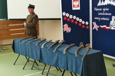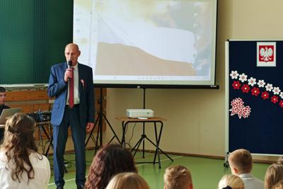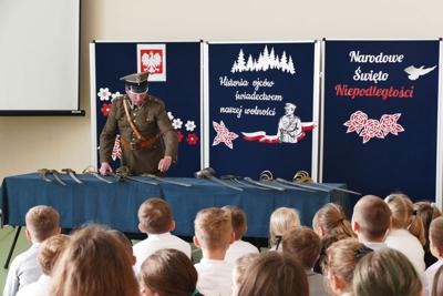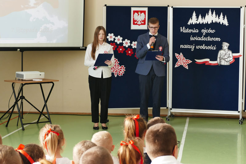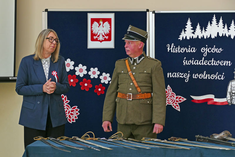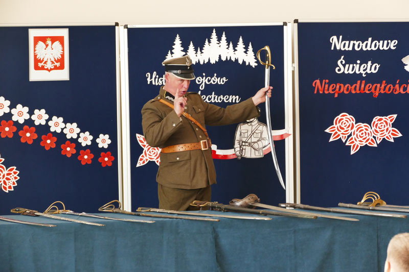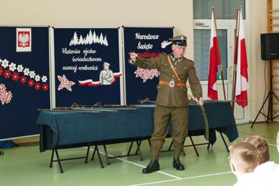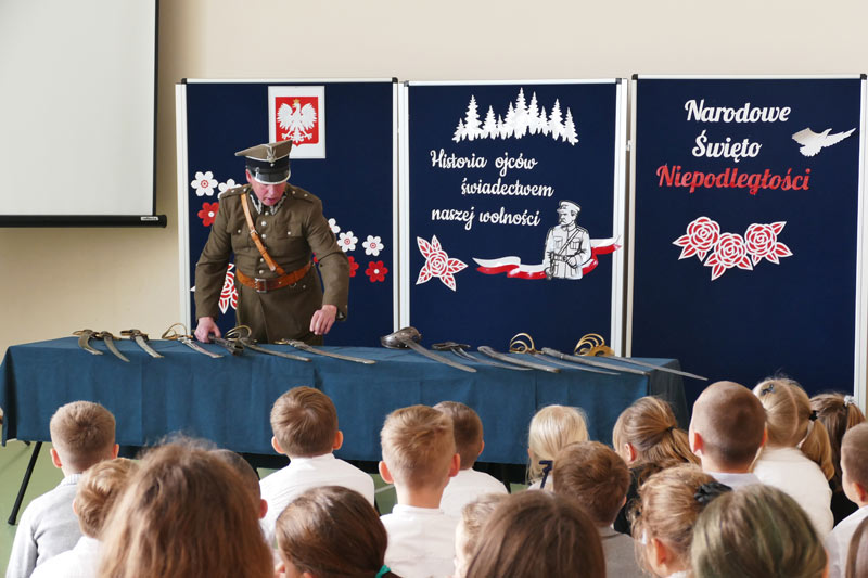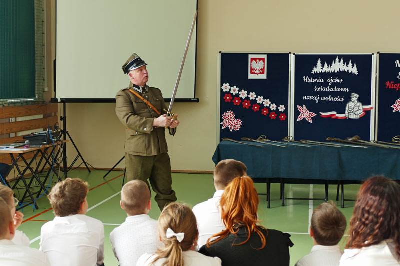 Z okazji Narodowego Święta Niepodległości uczniowie naszej szkoły pod kierunkiem nauczyciela historii przygotowali apel pod hasłem „Ojcowie Niepodległości”. Uroczystość była okazją do refleksji nad historią Polski oraz przypomnienia postaci, które swoją odwagą i poświęceniem wywalczyły nam wolność. Szczególnym punktem wydarzenia była ciekawa prezentacja historyczna, poprowadzona przez Pawła Sanewskiego – prezesa Stowarzyszenia Historycznego im. 71. Pułku Piechoty. Uczniowie mieli okazję z bliska obejrzeć szable, bagnety i inne elementy wyposażenia wojskowego z okresu międzywojennego. Takie spotkania pomagają lepiej zrozumieć historię, a także kształtują wśród młodzieży postawy patriotyczne i szacunek dla narodowych tradycji.