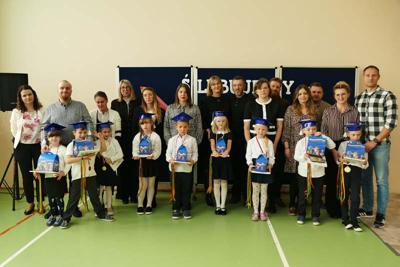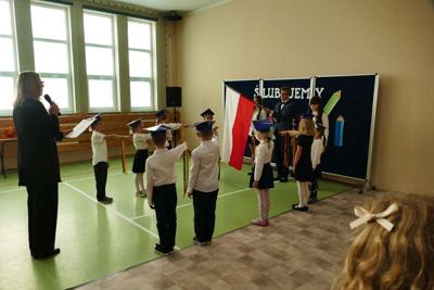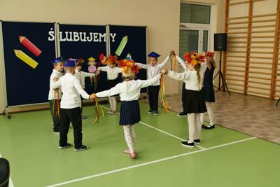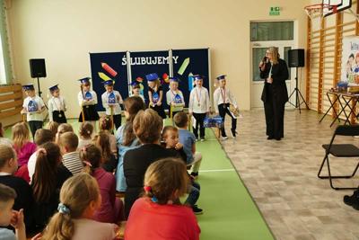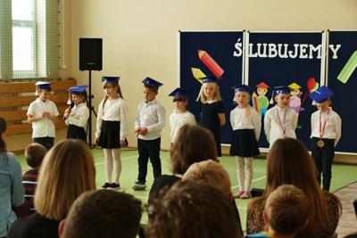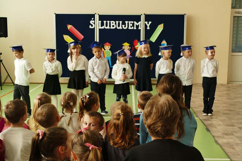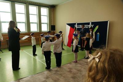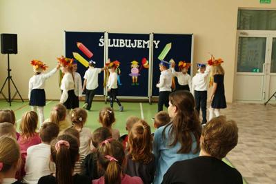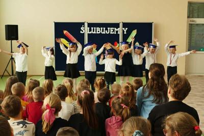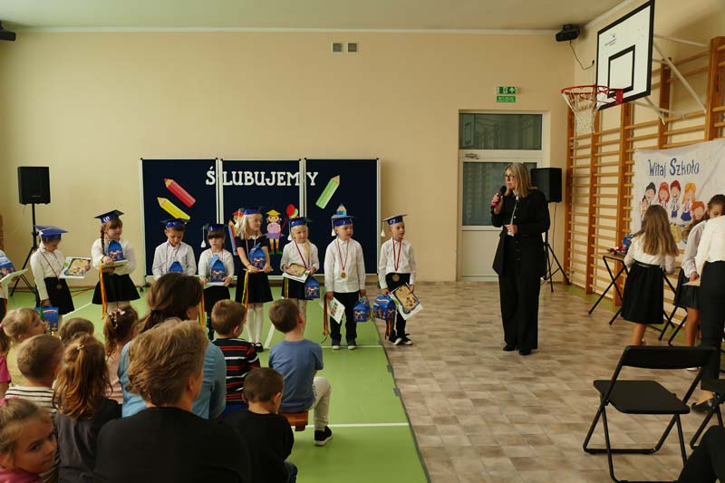 Dnia 13 listopada 2025 r. w naszej szkole odbyła się niezwykle uroczysta i wzruszająca chwila - ślubowanie klasy pierwszej. To wyjątkowe wydarzenie, które na długo pozostanie w pamięci najmłodszych uczniów oraz ich rodziców. Dzieci , zanim zostały przyjęte do grona społeczności szkolnej, przedstawiły to, czego już w szkole nauczyły się. Odświętnie ubrani i bardzo przejęci zaprezentowały przygotowany z wielkim zaangażowaniem program artystyczny, w którym nie zabrakło wierszy, piosenek i tańców. Po części artystycznej nadszedł moment, na który wszyscy czekali z niecierpliwością – ślubowanie pierwszoklasistów. Pani dyrektor dokonała aktu pasowania na ucznia-dotykając ramienia każdego pierwszaka dużym, kolorowym ołówkiem. W ten sposób dzieci zostały oficjalnie przyjęte do grona uczniów naszej szkoły. Na zakończenie uroczystości wszyscy uczniowie otrzymali pamiątkowe dyplomy, kuferek ze słodkościami oraz upominki od rodziców- piękną książkę. Nie zabrakło również wspólnych zdjęć, uśmiechów i gratulacji od rodziców. Na zakończenie uroczystości głos zabrała Pani dyrektor, złożyła życzenia dzieciom i ich rodzicom. Po części oficjalnej wszystkie dzieci wraz z rodzicami miło spędziły czas przy słodkim poczęstunku.