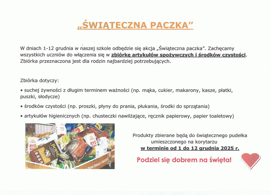 W dniach 1 grudnia-12 grudnia 2025 r. nasza szkoła organizuje zbiórkę żywności oraz środków czystości, aby wesprzeć najbardziej potrzebujące rodziny z naszej społeczności.