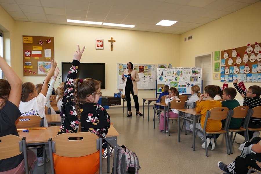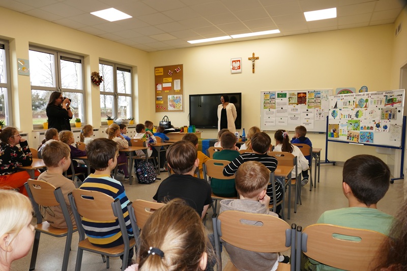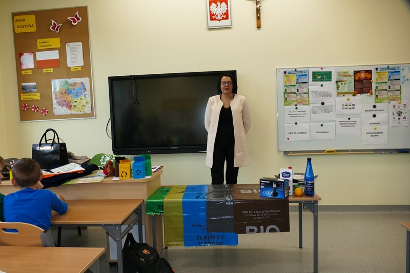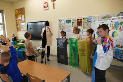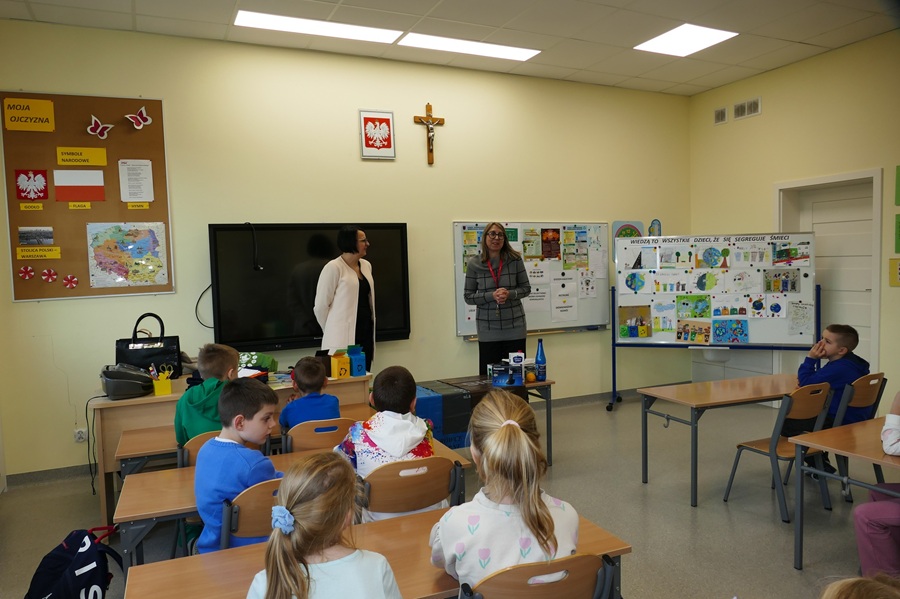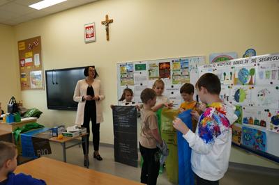 W mijającym tygodniu w naszej szkole odbyło się kolejne wydarzenie w ramach realizacji projektu Czysta Moc Energii. Uczniowie klas I-III uczestniczyli w spotkaniu z panią Wioletą Klimowicz, pracownikiem Wydziału Gospodarki Komunalnej Urzędu Miasta w Zambrowie. Przygotowując się do spotkania pod okiem opiekuna Koła Młodego Ekologa, uczniowie wykonali prace plastyczne związane z ochroną środowiska i segregacją śmieci. Na początku spotkania najciekawsze prace zostały nagrodzone przez panią Wioletę upominkami. Następnie uczniowie mieli okazję ugruntować swoją wiedzę w zakresie ochrony środowiska, sposobów dbania o czystość środowiska i powietrza, zasad segregacji odpadów i odnawialnych źródeł energii. Dalsza część zajęć poświęcona była prawidłowej segregacji śmieci i odpadów komunalnych. Dzieci w praktyczny sposób uczyły się prawidłowego rozpoznawania różnych frakcji odpadów i dzielenia ich do odpowiednich worków. Uczniowie aktywnie uczestniczyli w ciekawie prowadzonych zajęciach.